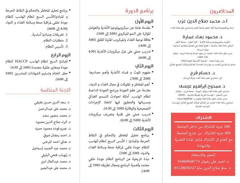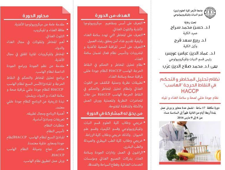 تعقد الكلية برعاية قسم النبات والميكروبيولوجى دورة تدريبية مكثفة بعنوان نظام تحليل المخاطر والتحكم فى النقاط الحرجة HACCP على مدار اربعة ايام من 6 الى 9 مارس 2016 من الساعة الثانية ظهراً وحتى السادسة مساءً.